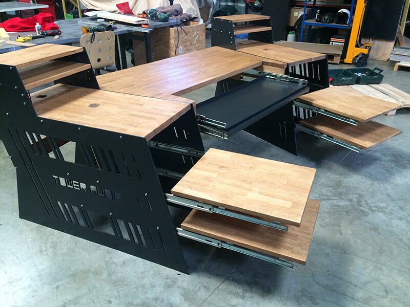 Le meuble que nous avons élaboré en collaboration étroite avec Nicolas Hornez de Tower Audio en est un parfait exemple. Il s’agissait de répondre à une demande « multi-usages ». En un seul et même lieu, produire, mixer jusqu’au mastering et pouvoir assurer des séances de formation. Respect des dimensions réduites du lieu, possibilité de moduler l’usage entre productions musicales et mixages. Penser aux utilisations présentes, mais aussi, aux évolutions en termes de choix de matériel. Que de challenges!