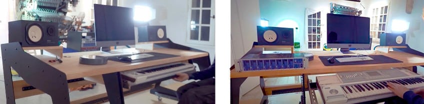 La plus grande partie du meuble de studio à été conçu et réalisé « a la main » dans nos locaux de Genay (proche de Lyon) et ajusté une fois sur place. Les matériaux choisis livrés par nos fournisseurs locaux; plateau en hévéa massif de 33mm pour une durabilité exceptionnelle, des flancs en acier 5mm découpés au laser (et personnalisables) donnent un aspect moderne et aéré à l’ensemble. Passe câbles pour laisser place nette, roulettes, tout à été pensé pour garantir une utilisation confortable, qui soit esthétiquement agréable à l’oeil et facile à vivre au quotidien.