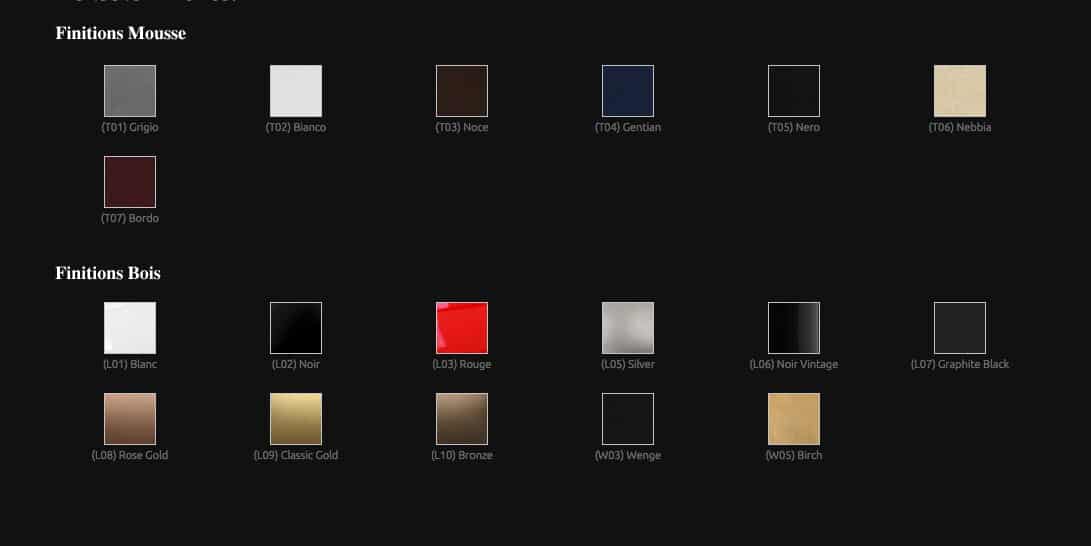 Finitions : Vous avez le choix entre 7 couleurs de mousses et 11 couleur de bois.